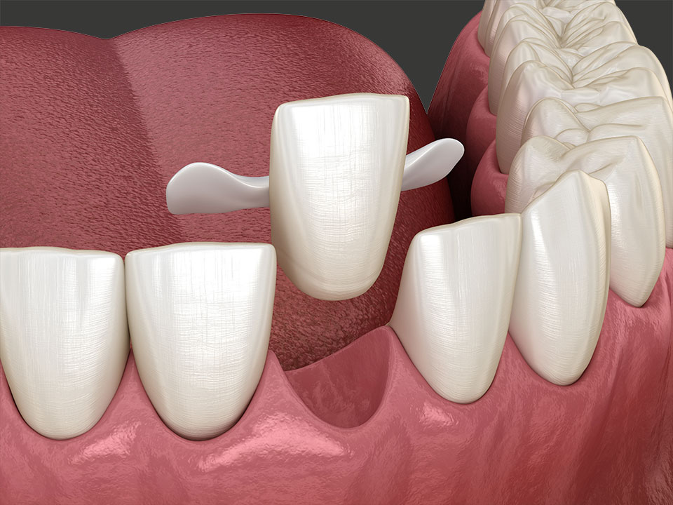 … ist eine zahnschonende Alternative. Die Klebetechnik schont die Substanz der Brückenpfeiler-Zähne. Denn anstelle der Kronen tragen sie die Brücke über zwei an den Zahnrückseiten angeklebte seitliche Flügel. Diese Brückenkonstruktion ist weniger belastend für die Pfeiler-Zähne, aber auch weniger belastbar. Deshalb eignet sich die Klebebrücke vor allem für Einzelzahnlücken im Frontzahnbereich und als Übergangslösung für Kinder und Jugendliche, bei denen Implantate noch nicht in Frage kommen.